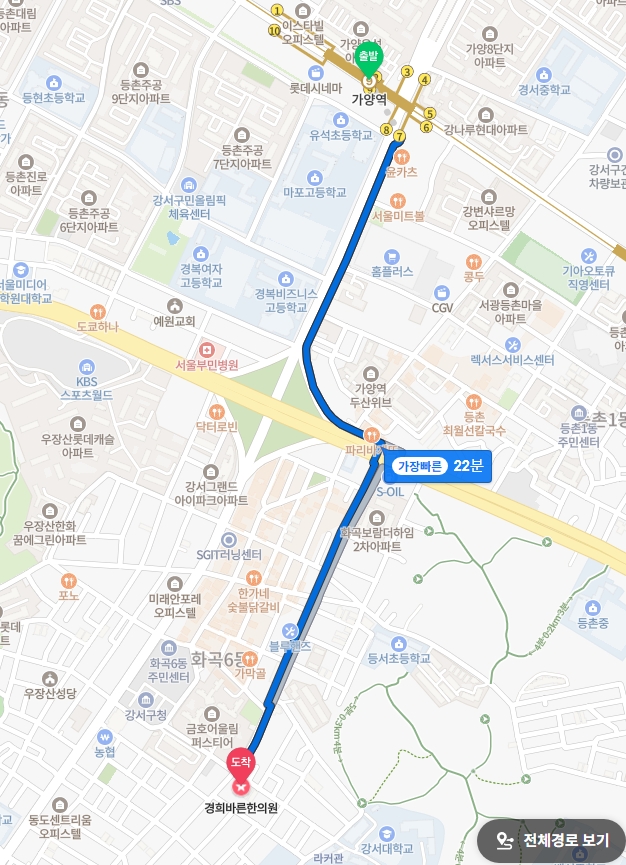 출퇴근할때에는 급행이 서는 가양역을 이용할 가능성이 많습니다. 7번출구로 나가 하이웨이주유소가 있는 방향으로 걸어가 건너가신 후 구도로를 따라서 걸어가면 22분정도가 걸려서 화곡동 경희바른한의원에 오실 수 있습니다.