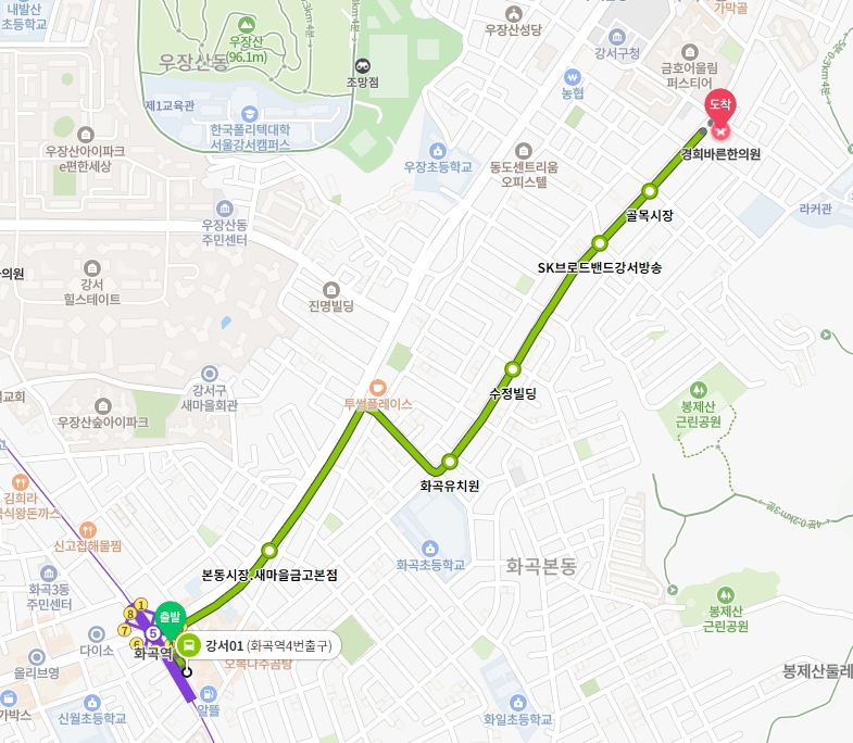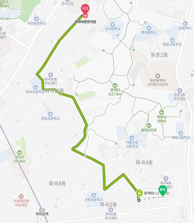 화곡동 경희바른 한의원 앞에는 마을버스 강서01, 강서02가 서는 "강서대학교"정류장이 있습니다. 등촌역이나 화곡역에서 버스를 타고 이용할 시에는 강서01을 이용하시면 됩니다.