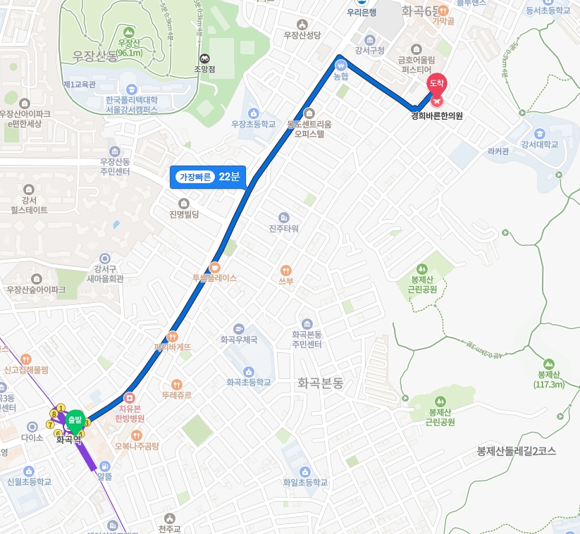 출퇴근할때에는 급행이 서는 가양역을 이용할 가능성이 많습니다. 7번출구로 나가 하이웨이주유소가 있는 방향으로 걸어가 건너가신 후 구도로를 따라서 걸어가면 22분정도가 걸려서 화곡동 경희바른한의원에 오실 수 있습니다.